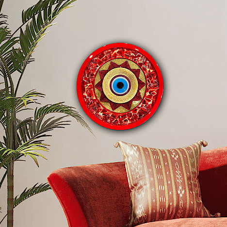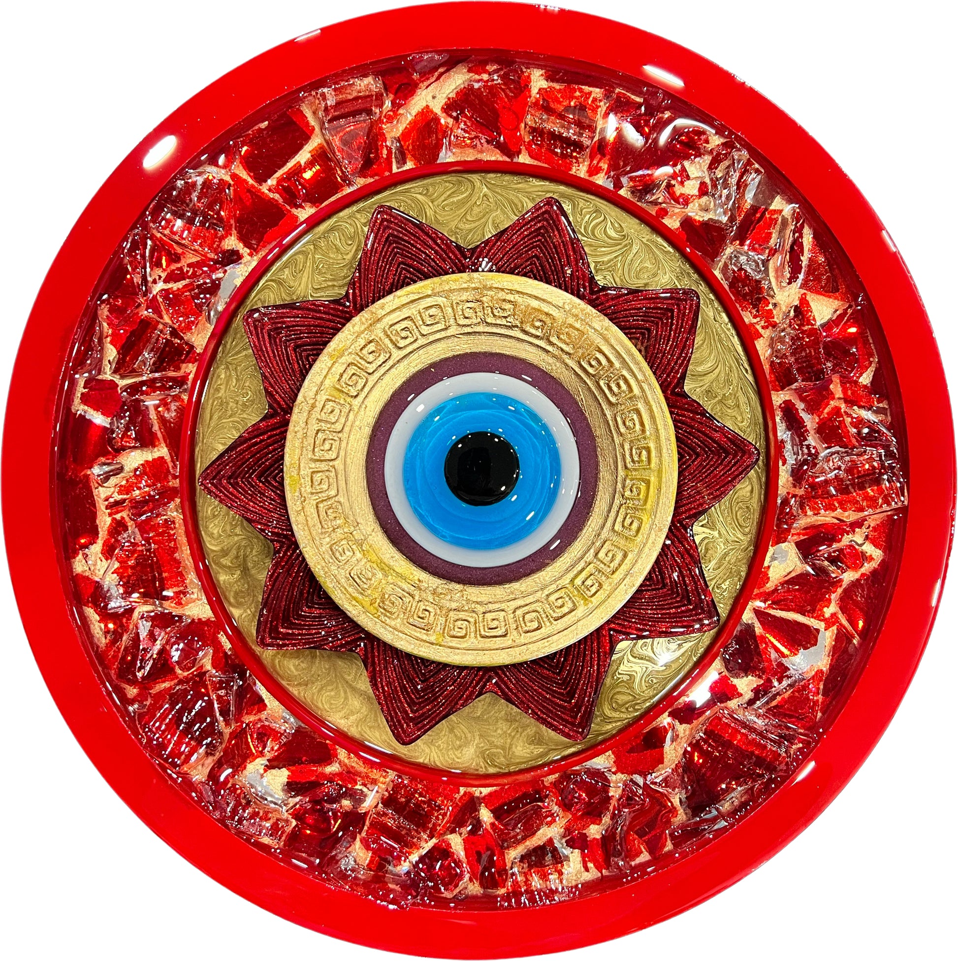 This striking art piece is a modern interpretation of the traditional mati—a symbol of protection and renewal. At its heart lies the familiar concentric eye, radiating with layers of blue, white, and black that ward off negativity and invite clarity. Surrounding it, a golden ring embossed with intricate Greek key patterns anchors the work in heritage, while deep red, lotus-like petals suggest resilience, passion, and rebirth.