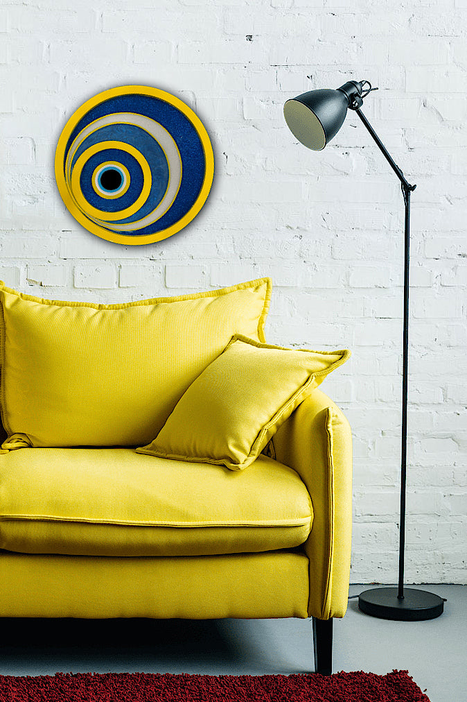 This bright 16" Signature art piece is a harmonious blend of tradition and modern design, inspired by the iconic mati symbol. Handcrafted with precision, it features a bold blue-and-yellow palette that evokes energy and positivity, reimagining the classic talisman with a contemporary edge. Its larger size ensures it commands attention as a refined centerpiece, adding timeless elegance to any space while celebrating a rich cultural heritage.