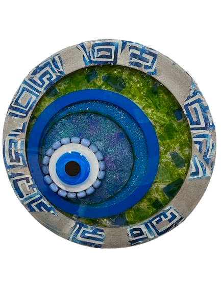 This unique 16" Mati piece blends vibrant artistry with meaningful symbolism. Layers of blue and green glass create a luminous, flowing backdrop that highlights the protective central eye. Surrounding the mati is a ring of traditional blue worry beads (koumboloi), adding texture, cultural depth, and a tactile element of calm and grounding. The combination of shimmering glass and the iconic beads gives this piece a soulful, modern-meets-traditional aesthetic—perfect for anyone who appreciates both craftsmanship and heritage. A striking, spiritually rich addition to any home or collection.