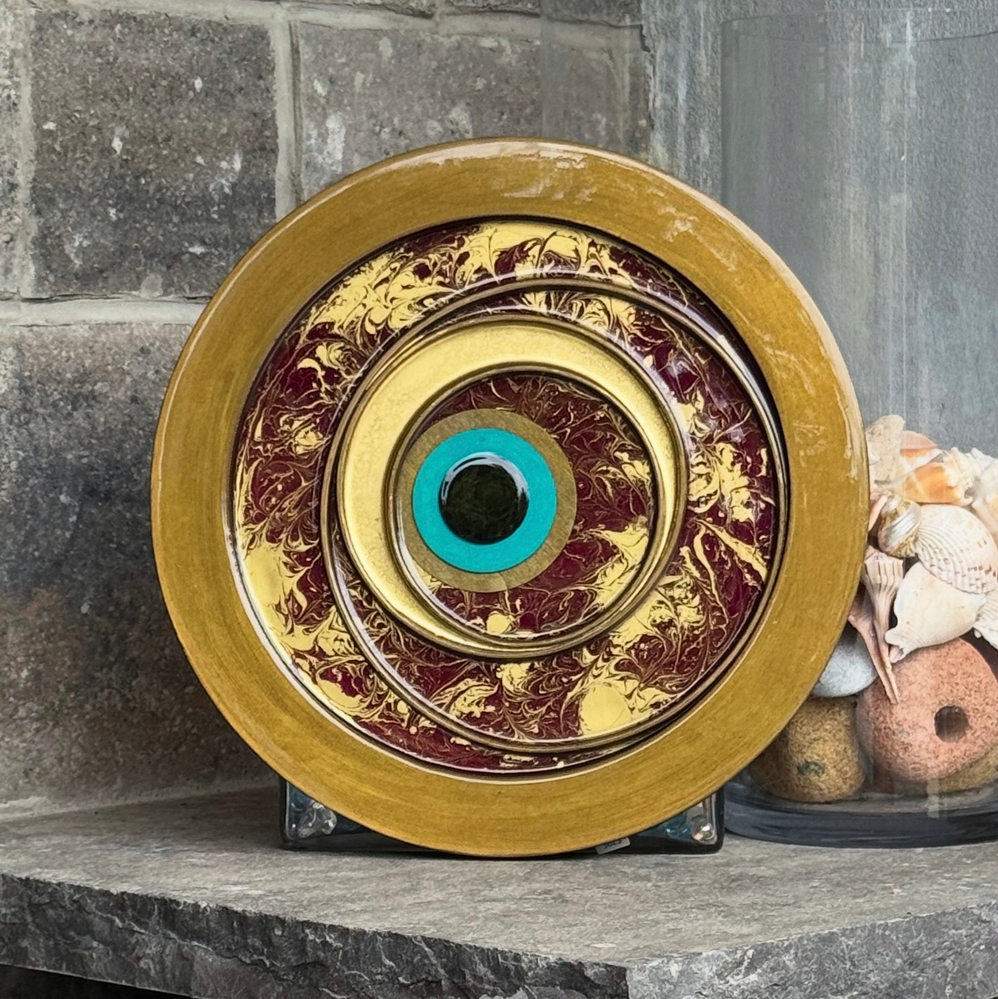 This luxurious 16" Mati piece captivates with its stunning blend of shimmering gold and deep burgundy swirls. The rich, flowing pattern creates movement and warmth, giving the artwork a regal, radiant presence. The metallic gold catches the light beautifully, while the bold burgundy adds depth and sophistication. Together, the colours form a striking backdrop that highlights the protective central eye. Elegant and dramatic, this piece brings both beauty and meaning to any space—perfect for those who love rich tones, bold artistry, and timeless symbolism.