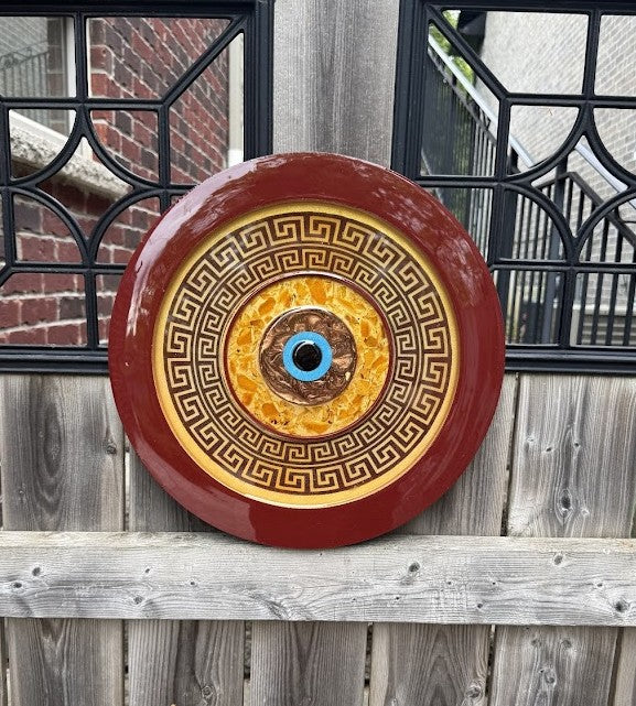 This elegant 16" Mati piece combines earthy sophistication with traditional Greek symbolism. Rich tones of brown, bronze, and shimmering gold glass create a warm, radiant backdrop that beautifully highlights the central protective eye. Each detail adds depth and texture, catching the light in subtle, luxurious ways. Encircling the centerpiece is a bold Greek key border—an iconic motif representing eternity, unity, and protection. The blend of natural hues and vibrant accents gives this piece a timeless, grounded feel, making it the perfect addition to any space seeking both beauty and meaning.