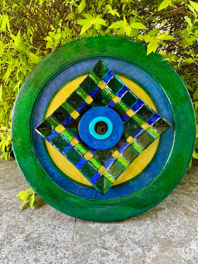This striking 16" Mati piece features a beautifully intricate square glass plate that surrounds the central protective eye, creating depth, dimension, and a jewel-like glow. The design bursts with vibrant greens, sunny yellows, and rich blues—colors that evoke harmony, clarity, and renewal. The detailed glasswork adds texture and movement, making the piece shimmer from every angle. Bold yet balanced, this artwork blends modern vibrancy with the timeless symbolism of the Mati, offering both protection and a captivating visual centerpiece for any space.