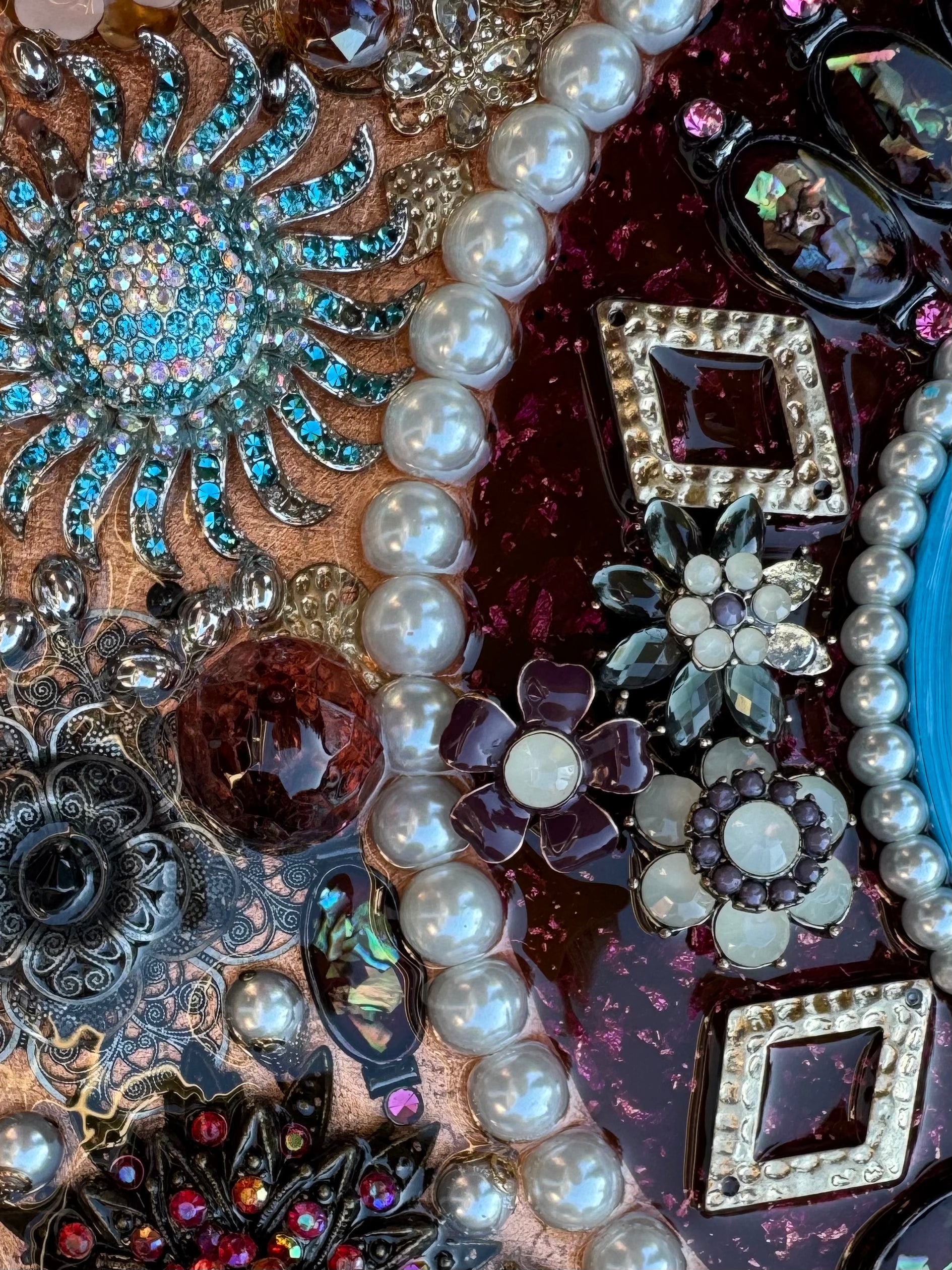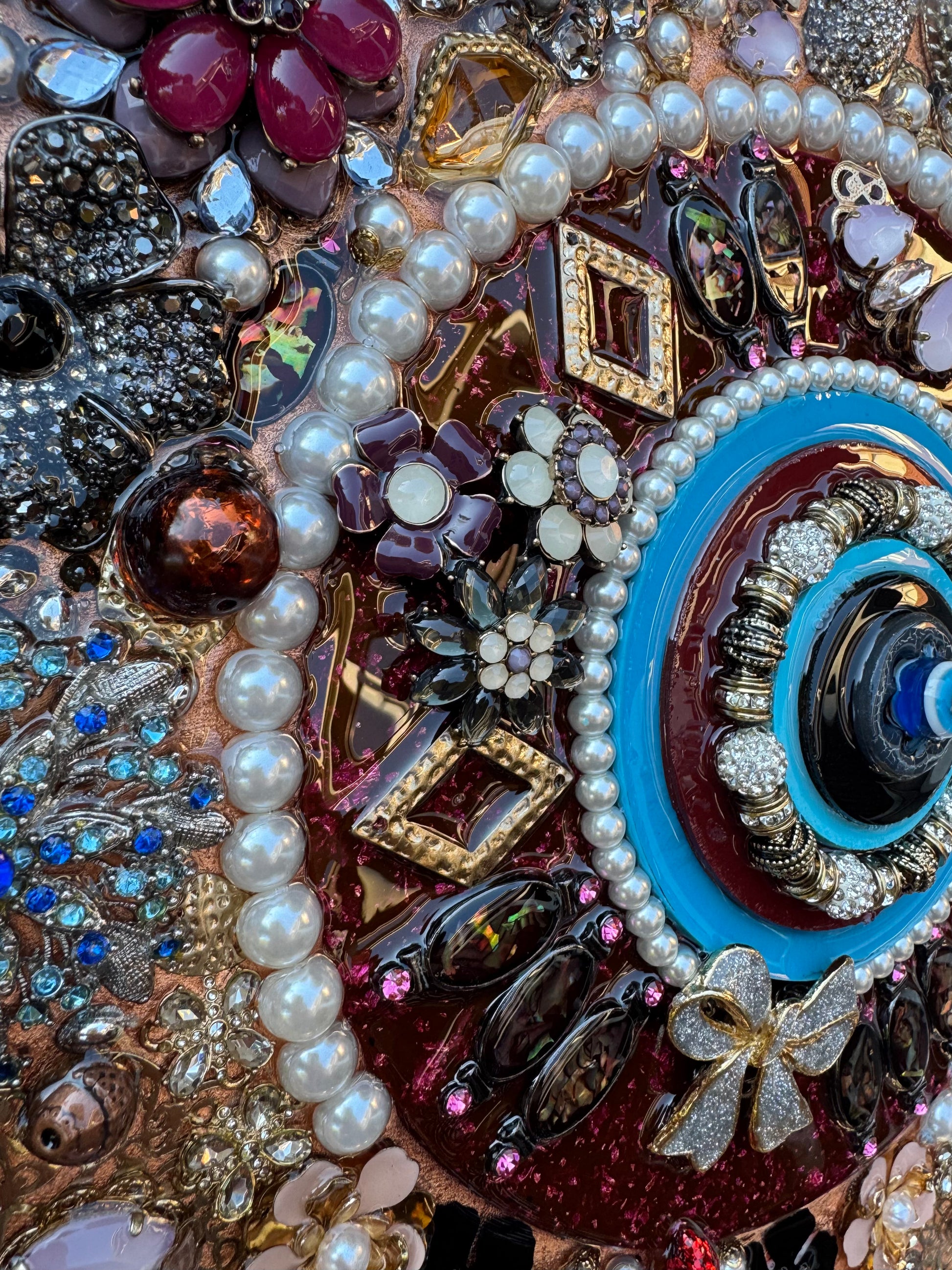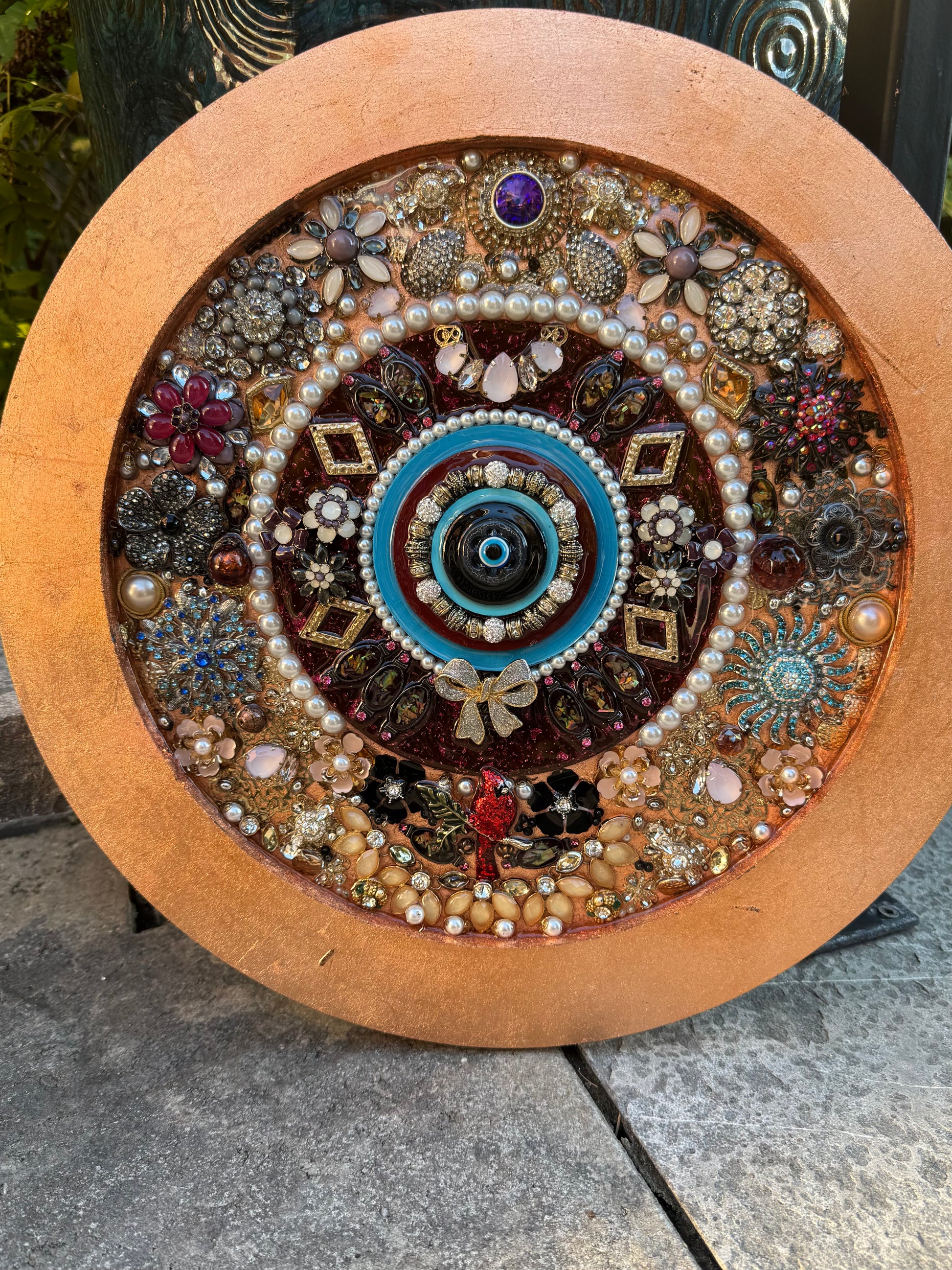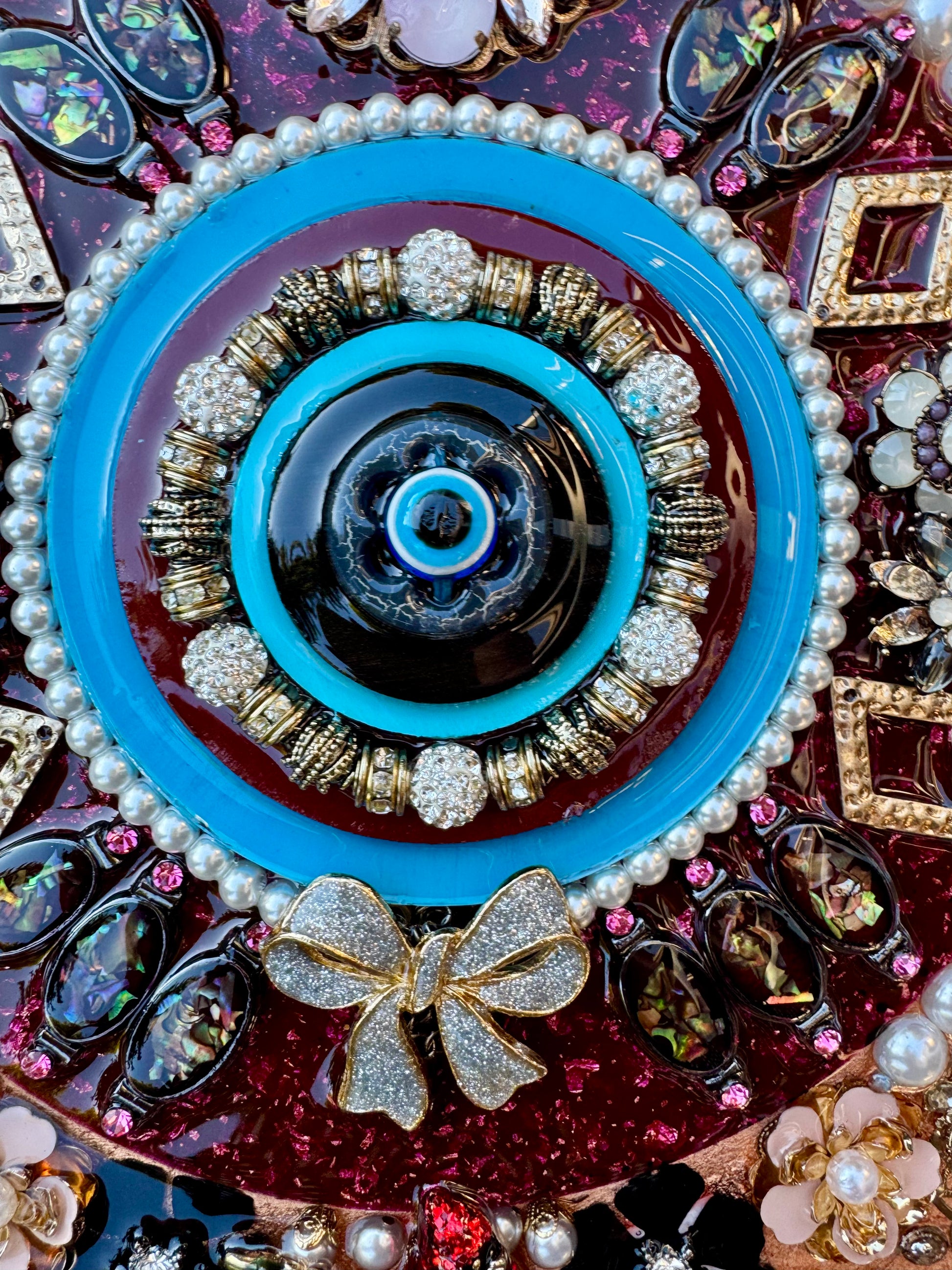 Its azure heart pulses with silent warnings, surrounded by rings of reclaimed treasures—once earrings, brooches, and heirlooms that adorned celebrations and marked sorrows, now united in circular vigilance. Each fragment carries memories of its former life, reimagined in this constellation of guardianship.