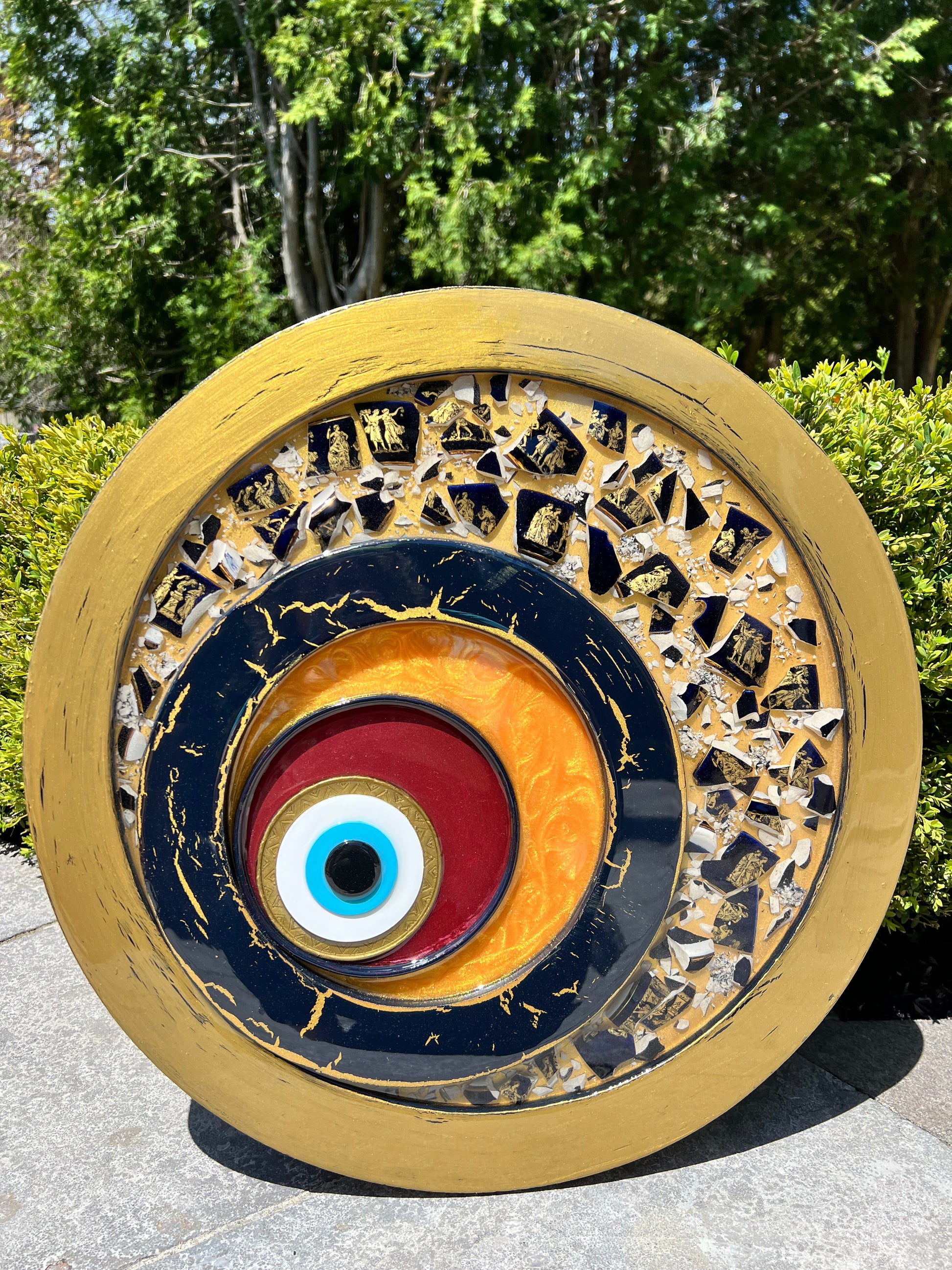 This 20" stunning art piece from the Renaissance Collection is a modern twist on a timeless symbol of protection. Layered with rich textures, gold accents, and mosaic fragments featuring ancient Greek figures, this piece was made to watch over and mesmerize. Each ring tells a story-from divine myth to bold modern energy.